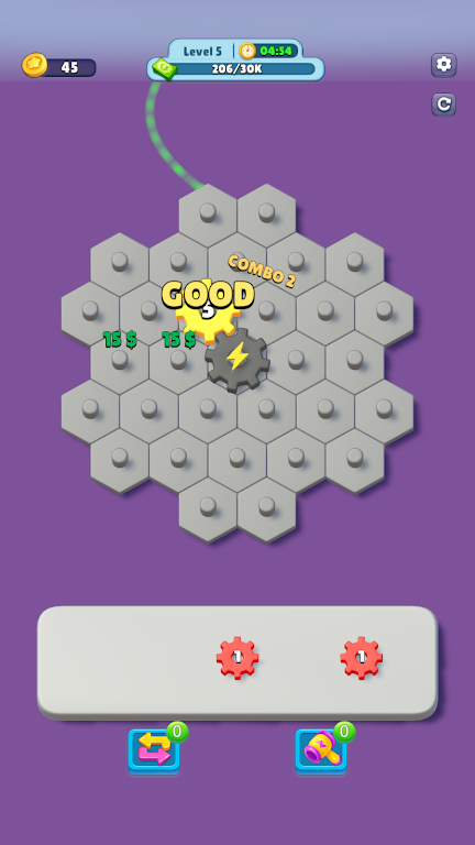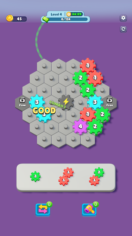 放置齿轮的界面设计以清新简约的风格为主,让玩家可以专注于齿轮的合并和升级。游戏中的每个齿轮都有独特的颜色和形状,这不仅使得视觉效果更加丰富,也帮助玩家快速识别不同级别的齿轮。在操作过程中,拖放的动作流畅自然,极大地提升了游戏的可玩性和趣味性。