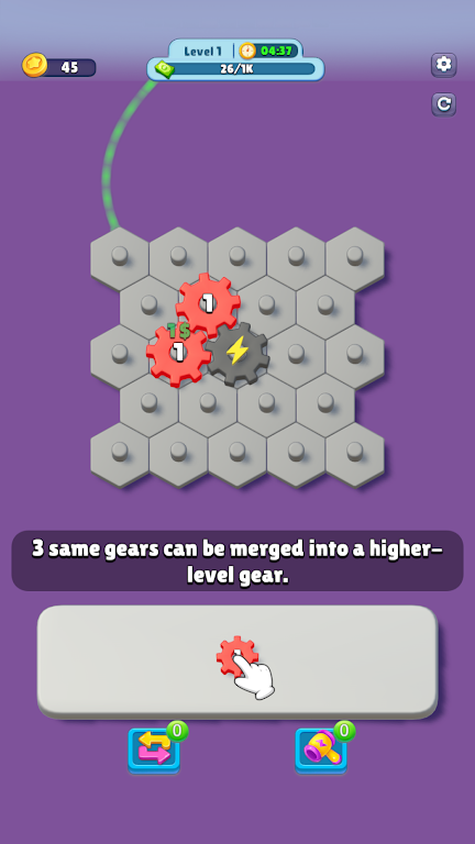 游戏的基本机制非常直观而易于上手。玩家在游戏界面上可以看到多个初级齿轮,这些齿轮的外观和功能相似,但一旦玩家将三个相同的齿轮合并在一起,就能生成一个更高级别的齿轮。升级后的齿轮不仅外观更加精致,其运作效率和性能也会随之提升。玩家需要将这些齿轮放置在合适的位置,以确保它们的连锁反应能够产生更多的资源。