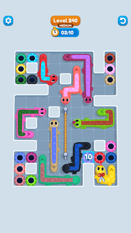 《壁虎逃脱》是一款内容丰富、引人入胜的解谜冒险游戏,玩家将踏上一段富有挑战性的旅程。游戏中,您将控制多只壁虎,通过不同的颜色和长度进行导航。时间是您最大的敌人,因此您必须在规定时间内带领壁虎安全抵达目标洞口。