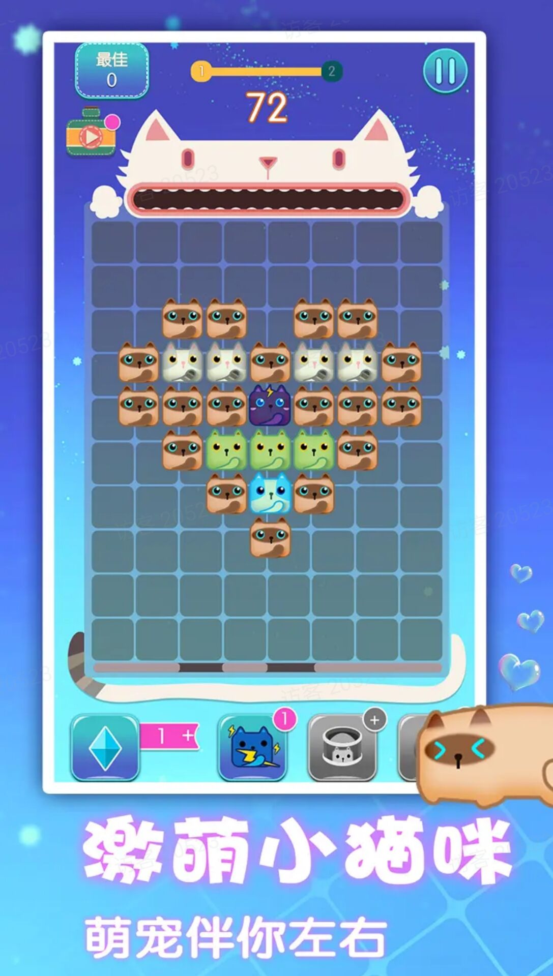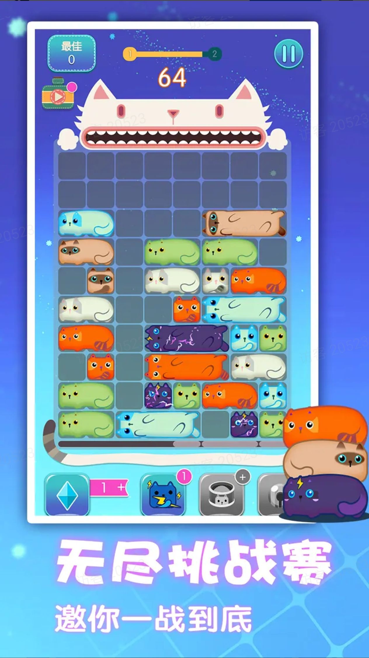 一款超萌的消除小游戏,游戏玩法非常简单,左滑右滑消消消,水平移动方块来填满和清除整行。还有各种效果惊人的道具帮助你度过难关哦。