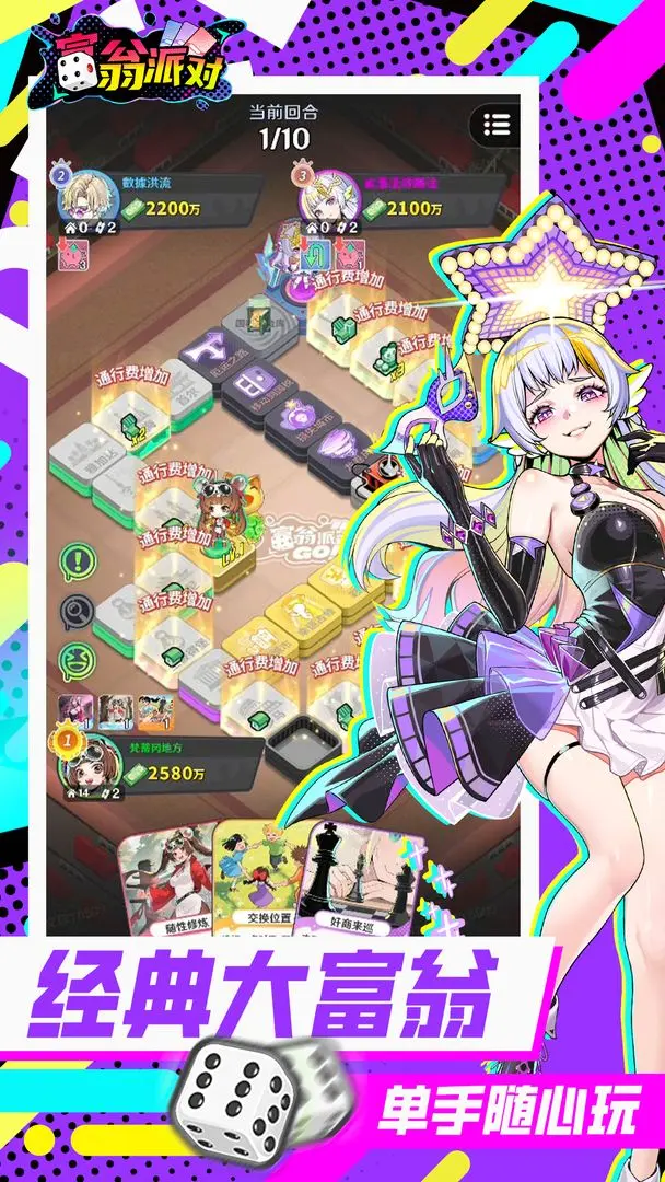 在《富翁派对》中,玩家可以从多个丰富多样的角色中进行选择。每个角色都有其独特的技能,这些技能可以在游戏过程中产生重大影响。例如,有的角色可以增加获得财富的几率,有的则能够对对手造成干扰,甚至改变游戏规则。玩家在选择角色时,需要考虑其技能如何与手中的卡牌相互配合,从而制定出最佳的胜利策略。