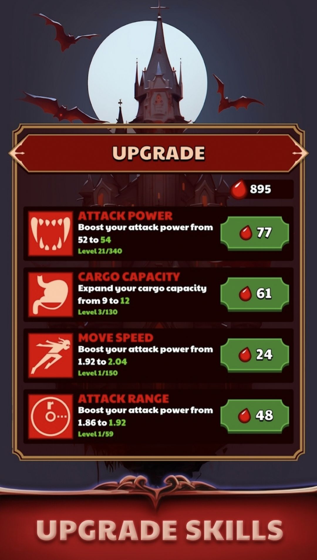 贝拉的复仇故事是游戏的核心,您的任务便是帮助她追寻那些勇敢而又愚蠢的人类,清除他们对她城堡的威胁。每一个被捕猎的入侵者都将为贝拉带来新鲜的血液,这不仅能增强她的力量,还有助于她学习并掌握新的吸血鬼技能。随着游戏的进行,您将看到贝拉逐渐恢复昔日强大的能力,重新成为让人敬畏的存在。