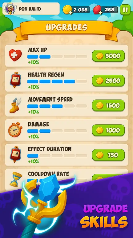 在《天堂部落》中,经济因素同样重要。通过战斗所获得的金币,你可以不断进行元进展,花费金币对角色的属性进行永久升级。这让你即使在新一轮挑战中,也能够以更强大的姿态再次出发。