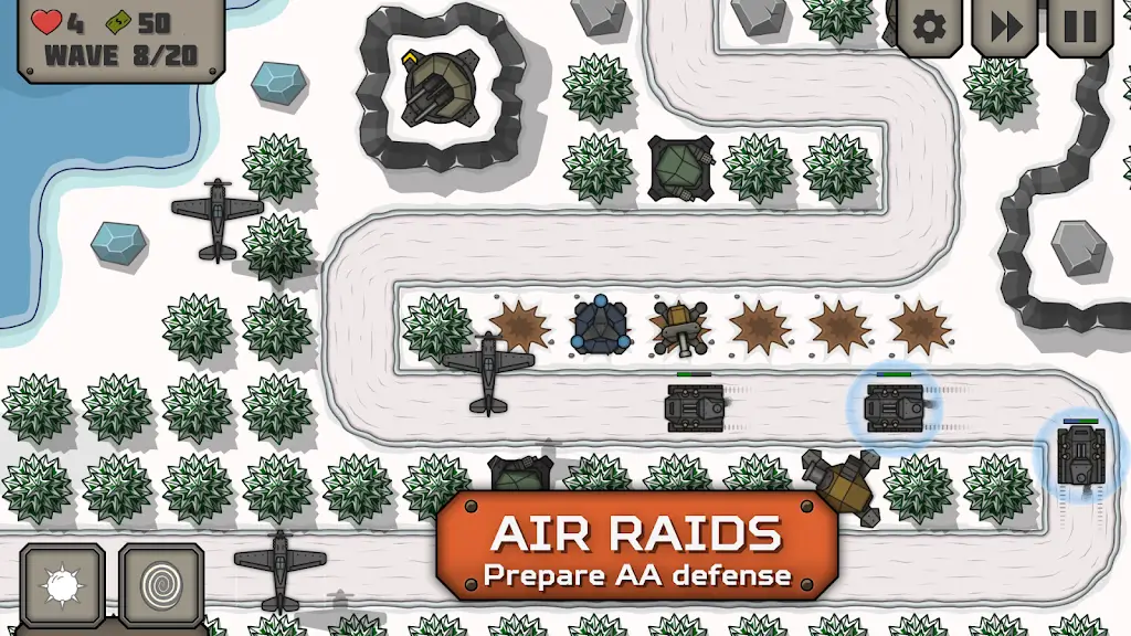 敌人不仅有地面部队,还将空中力量派遣到战场上。在《战术战争2》中,您必须时刻保持警惕,调整策略以应对敌人的飞机。防空枪塔将在游戏中发挥至关重要的作用,确保您的基地免受空袭的威胁,更加丰富了塔防的整体战略体验。