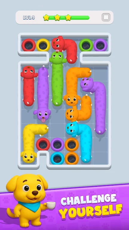 在《狗狗逃脱》这款充满创意和乐趣的解谜冒险游戏中,玩家将与一群活泼可爱的狗狗们共同展开一场令人兴奋的旅程。这些小狗们个性十足,色彩斑斓,每一只都在找寻属于自己的逃生之路。它们有的可能因为好奇而迷失方向,有的则在探索中需要你的帮助。你能否带领这些狗狗安全到达它们各自的颜色匹配逃生洞?