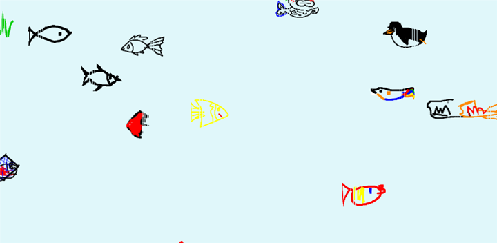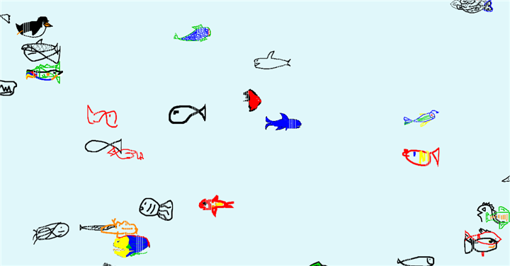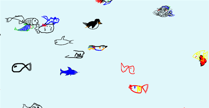 在赛博鱼缸中,玩家无需任何注册或登录手续,直接进入游戏便可开始创作。通过简单的绘画界面,玩家只需用鼠标或触控笔描绘出自己想象中的小鱼。一旦画出的鱼和系统内的鱼形态相似度达到60%以上,玩家就可以点击“make it swim”按钮,将自己的作品放入共享的鱼缸中,共同构建这个虚拟水域的生态。