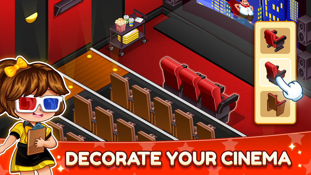 为了让您的影院更加吸引人,您还可以为角色装扮。收集基于热门电影和角色灵感的精美服装与配饰,让您的影院经理展现独特的风格。通过不断解锁新的时尚单品,提升您的表现,吸引更多顾客前来观影。