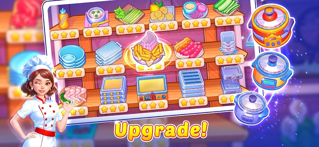 通过游戏中赚取的硬币,您可以升级厨房设备,为您的顾客提供更好的服务。投资于高效的炊具,将大大提升您烹饪的速度与食物的质量,让您的餐厅在竞争中脱颖而出。此外,您还可以为餐厅增添冰淇淋和甜点等甜品项目,进一步丰富顾客的用餐选择。