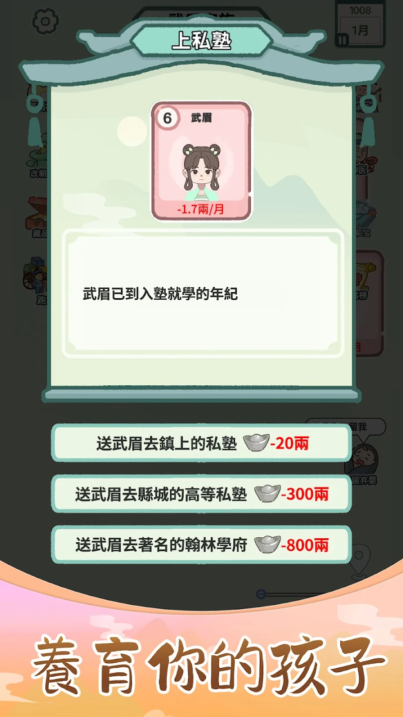 红烛高照时,谁与你并肩执手?是名门闺秀巩固家势,是江湖侠女拓宽人脉,还是寒门才女相守相知?婚后育子,你亲自教导儿女识字习礼,安排他们学艺、游历,或送入太学、镖局。他们的性格与能力,将决定家族下一代的兴衰。