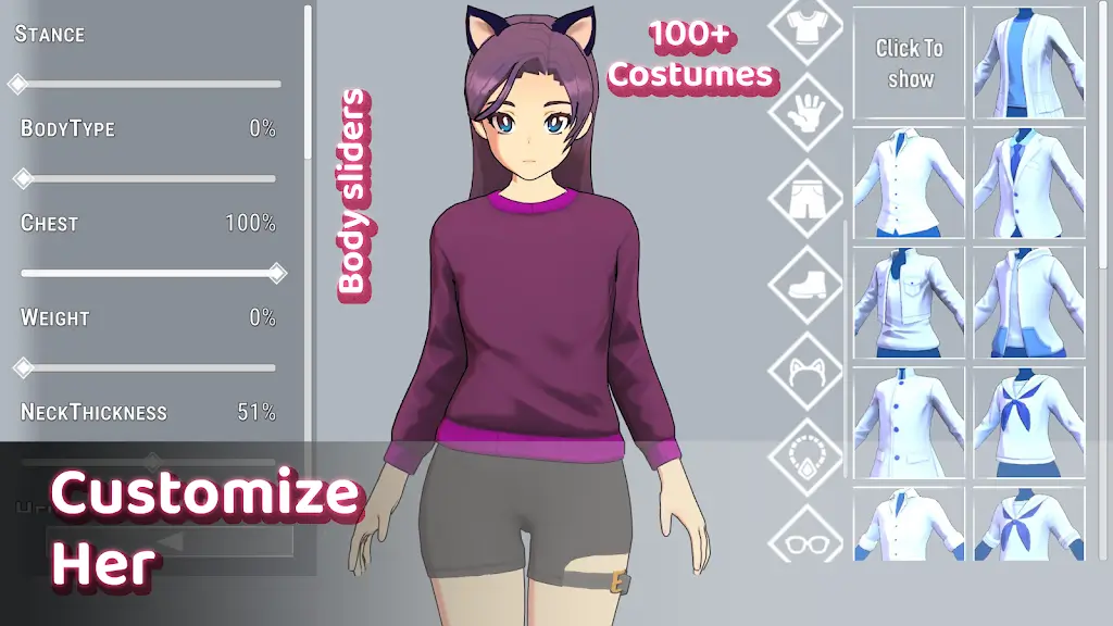 《女友模拟器》是一款独特的模拟类游戏,玩家可以在这里体验与虚拟女友互动的乐趣。此次MOD版本带来了全新特色属性,玩家可以轻松解锁丰富的道具,增强游戏体验。同时,免安装的秒玩模式,让您无需繁琐的安装步骤,快速进入游戏世界,享受与虚拟女友共度的美好时光!无论是约会、聊天还是展开浪漫的冒险,这里都有无限可能,快来体验吧!