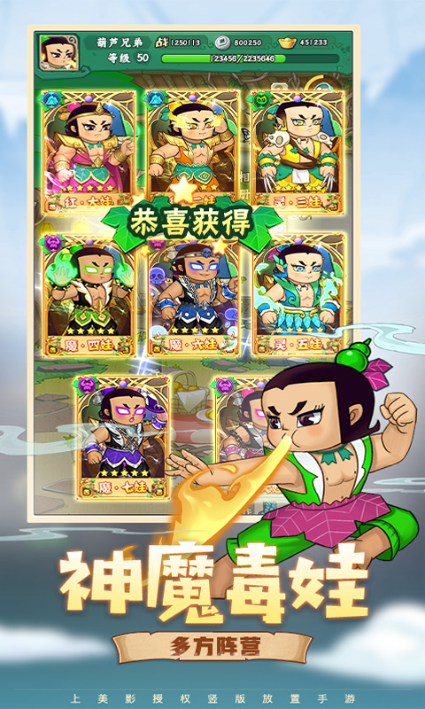 由上海美术电影制片厂正版授权,以86年剪纸风《葫芦兄弟》动画片为原型的手游大制,深度还原动漫情节。游戏内含全新特色玩法-葫芦直充,可通过游戏进度获取钱包余额,可在游戏内实现免费提现,激活累计充值活动的超强体验功能。可轻松练级,休闲挂机,忙时经验不错过,上线挑战奖励多丰富,您可以和葫芦七兄弟共闯妖巢!带领葫芦兄弟披荆斩棘,洞破妖洞大门!保住穿山甲,救出爷爷,就在《葫芦兄弟-七子降妖》!