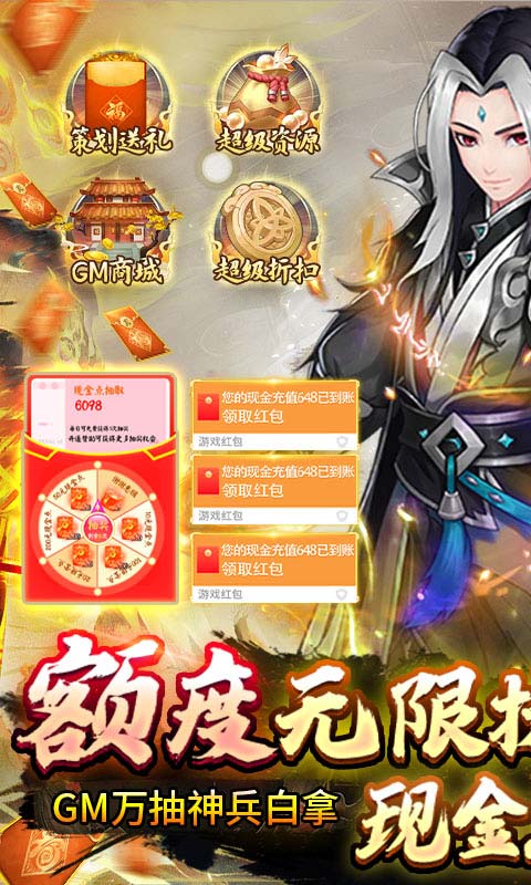5.充值比例1:1000,上线送v12,海量材料,全新外观,无限资源,现金转盘每天免费领取,助你称霸武林一统江湖!