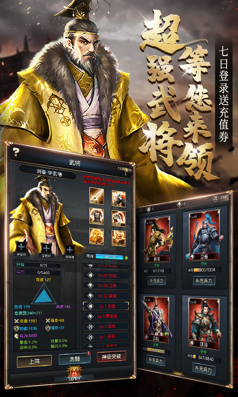 福利2:七日登录送充值券、金色装备、红色装备、女将碎片、超强武将典韦,大量材料等您来领取!