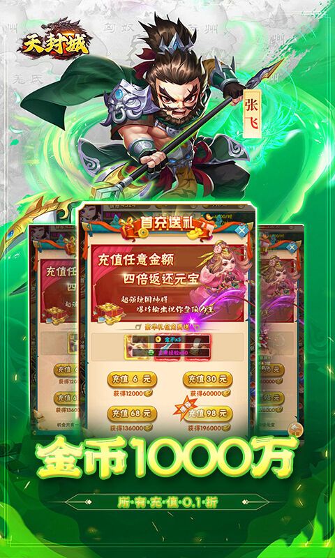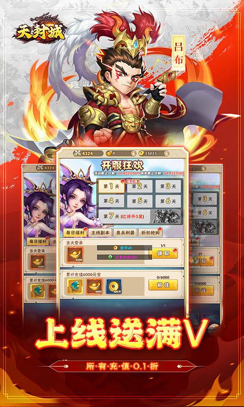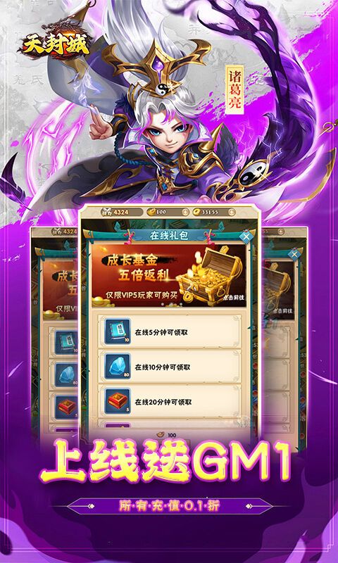 上线即送:上线送满V、GM1、138888元宝、金币1000万、十连招募、所有充值0.1折