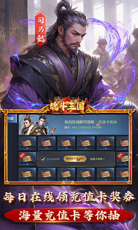 年度精品三国卡牌手游《魂斗三国》火热上线!上线直接开启0.1折优惠,首充仅需0.06元,不想花钱再送2021充值卡,每日签到百连抽和无限抽卡狂欢!进入游戏玩家们通过在同一张地图上竞争战斗,通过策略和实力来决定胜负,胜者为王,败者为寇!竞争过程中可使用空城计、奇门八卦等计策助阵!也可单独行动或与其他玩家结盟共同作战!游戏内还原真实天气系统以及地形关卡设计使得游戏更具挑战性和策略性,为你带来沉浸式的游戏体验!