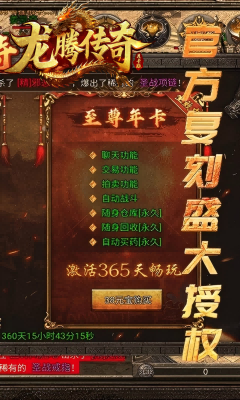 《龙腾传奇》是一款大型多人在线传奇游戏,采用市场领先三端引擎,游戏体验为2002年的盛大原版。让老玩家能够重温当年的怀旧体验。游戏为月卡收费模式,所有爆率都开放,没有任何爆率控制,全自由打金。