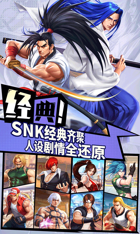 游戏涵盖了草薙京、特瑞、不知火舞等“拳皇”系列经典人气角色及橘右京、娜可露露等知名人物。自由随心搭配阵容,炫酷技能连击不断,热血格斗情怀不止;升阶系统不断变强,陪伴主角从格斗菜鸟成长为格斗家的热血格斗之路