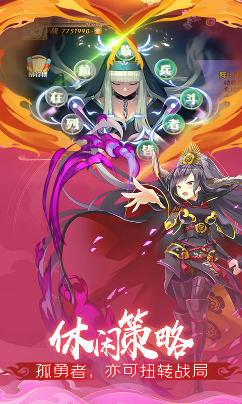《时之幻想曲》在经典SLG玩法基础上,进行轻休闲优化,不造兵不跑图,避免多线操作的繁琐,无压力无负担,排兵布阵,一锤定音。枪兵、弓兵、骑兵、阴阳师、步兵等兵种,追随各个战姬一起轻松成长,爽快战斗。