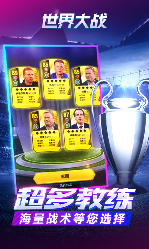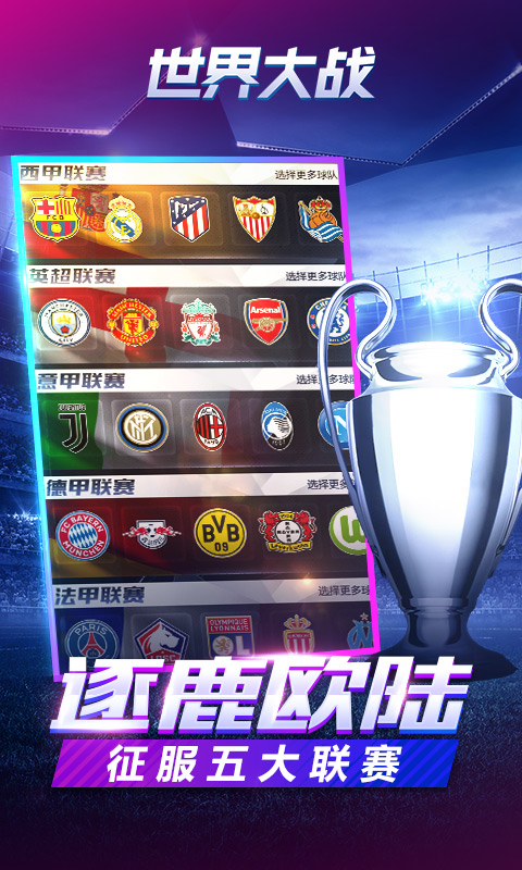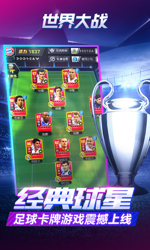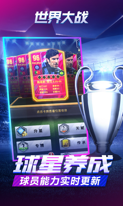 全新H5足球游戏力作。集球星收藏,球员养成,布阵对战,为一体的足球卡牌游戏。