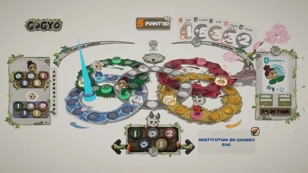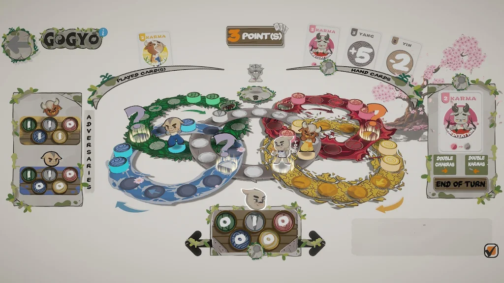 在《五行战纪》中,玩家通过使用三种不同类型的牌来实现移动和互动。牌的种类包括“阴”牌,允许玩家向后移动以调整位置;“阳”牌,可以帮助玩家前进,获取更多的查克拉;而“业力”牌则是用来与对手进行互动,可能改变局势,给对手施加影响。通过这些牌的灵活运用,玩家可以制定出复杂的策略,从而获得游戏的胜利。