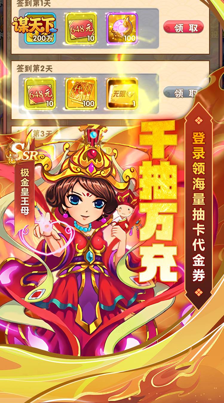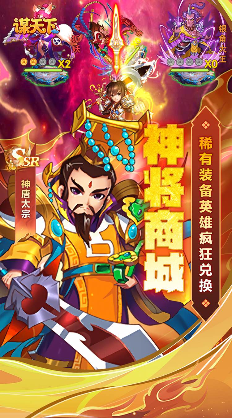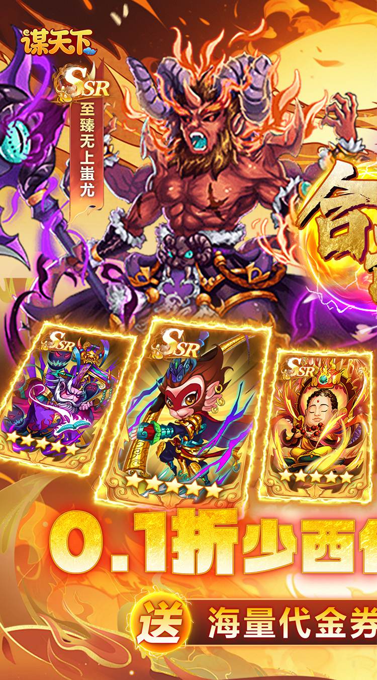 0.1折西游回合卡牌《谋天下(0.1折少西代金免费版)》,西游少年开天辟地,称霸三界。上线即送至尊满V特权、解锁超多功能,每日签到再领万元真充卡、千抽抽卡令、海量代金券,更有疯狂商城永久激活元宝、银币、经验等等,英雄、宝物、装备海量兑换,零氪也能集齐三界神仙,爽玩西游世界!