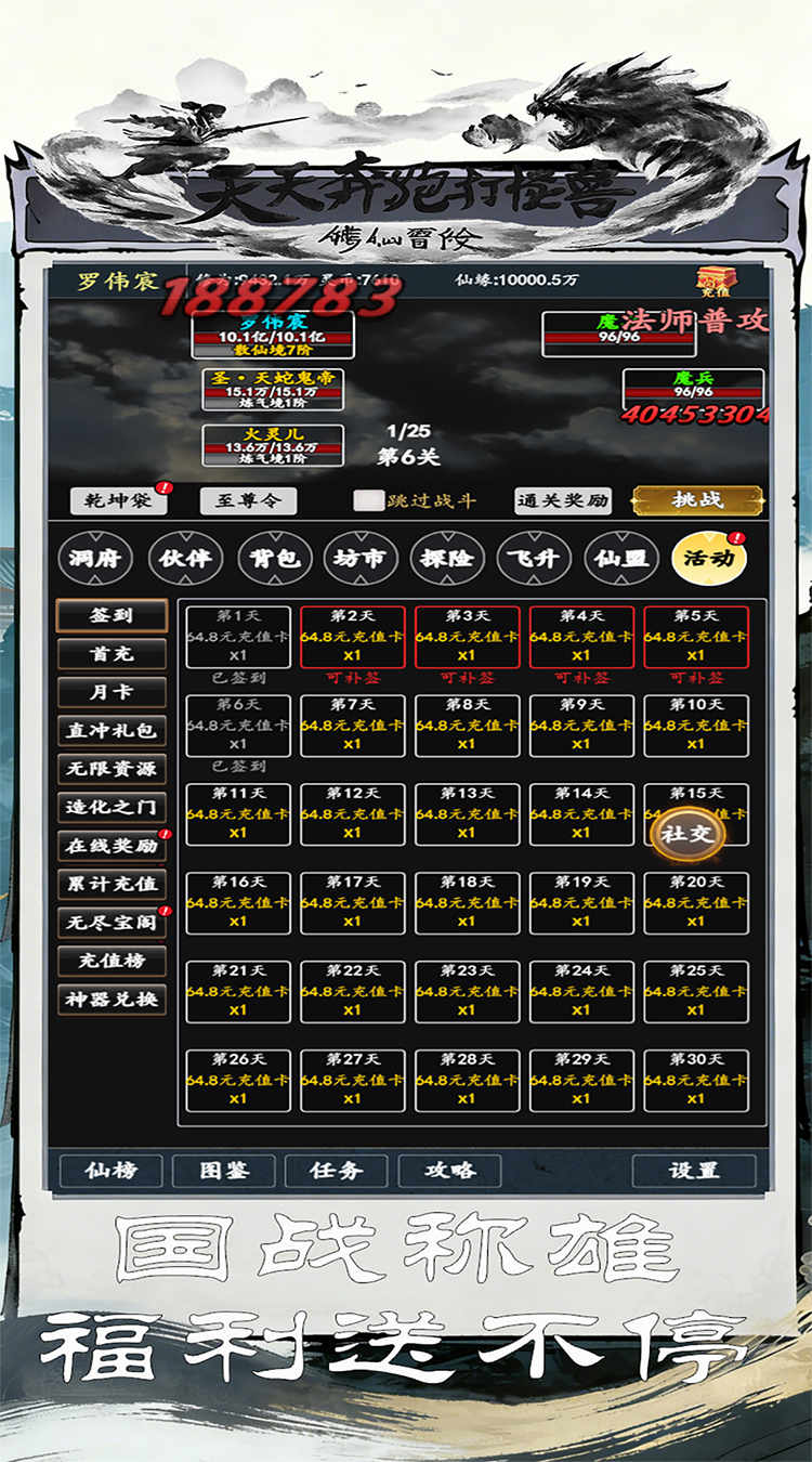 这是一款以文字为主、简画风格的修仙放置游戏。玩家将扮演一位寻仙问道的普通凡人在四大种族历练,通过自身努力修炼,摆脱肉体桎梏,渡劫逆袭成仙。游戏围绕 “修仙” 设计了丰富内容,包括国战修仙、放置历练、功法系统、装备系统等,玩家可御剑历练、独自探险,获得绝世宝藏。