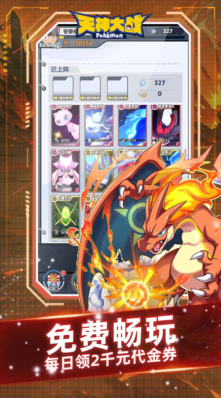 《天神大战(0.1折日送千元代金免费版)》集齐了宝可梦全体小精灵,上线即送VIP9特权、百抽精灵球、万元钻石,每日登录再领两千元直充代金券,直充海量钻石礼包。精灵球轻松捕捉全体神兽,全服限定结缘神兽风王。卡牌挂机解放双手,轻松躺赢,快来回味童年快乐!