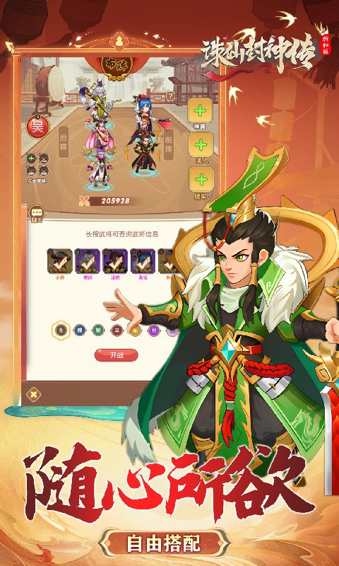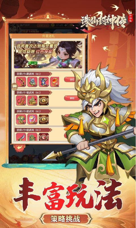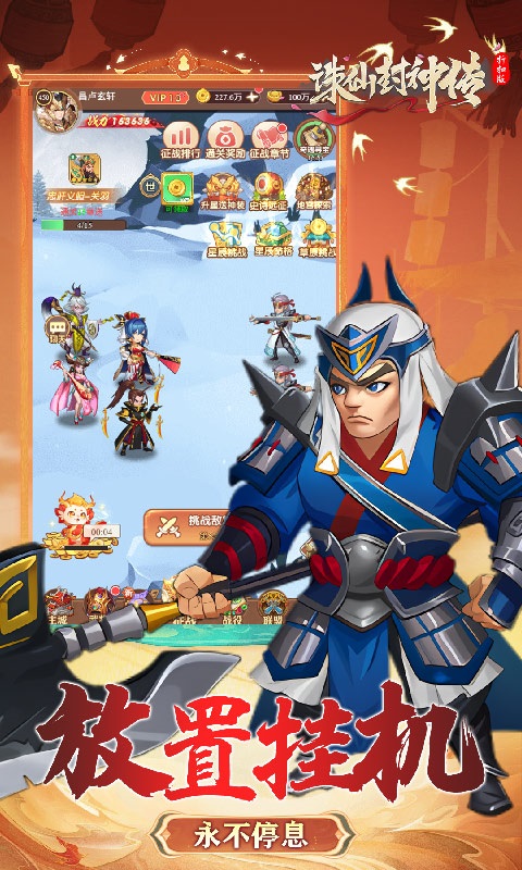 诛仙封神传是一款以三国为背景,高品质有策略的Q版放置卡牌手游!创新玩法各式各样来袭,跨服交友、跨服竞技通过多种搭配打造一支属于玩家的专属阵容!更有海量福利,累登送百万福利,免费送千抽,天天领抽卡,轻松玩转人人高战力!多式副本让玩家身临其境乐翻天,炫酷动态技能打斗特效高度满足玩家需求。更多好玩不厌的精彩独特玩法等着您来亲身体验!