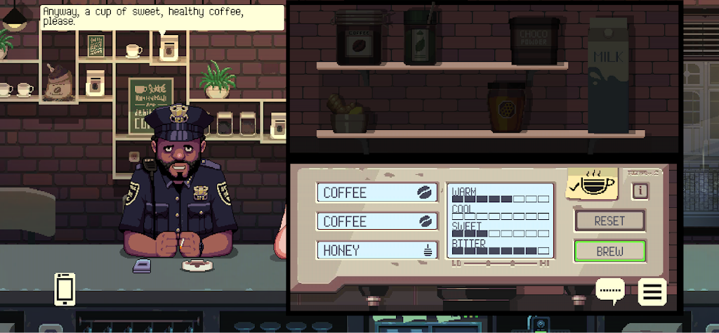 在咖啡闲聊中,调制饮品不仅是一项简单操作,而是一种基于对人物心理状态细致揣摩后的艺术创作。玩家需要利用咖啡厅内有限的食材,结合顾客当下的情绪与故事,设计出专属的暖饮配方。不同的饮品成分和搭配会引发不同的情感反应,能够在关键信息揭示和故事发展中起到桥梁作用。这种设计赋予游戏策略性和创造性,让玩家不断探索如何用饮品成为连接人与人之间的一座桥梁。
