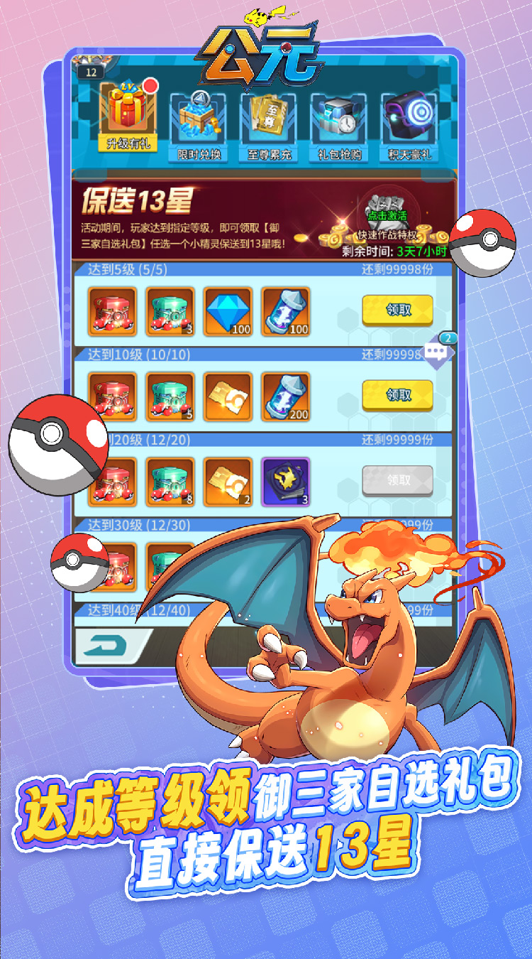 冒险途中,等级提升至关重要!达到指定等级,即可领取丰厚的【御三家自选礼包】!你可以选择自己钟情的初始伙伴(妙蛙种子/小火龙/杰尼龟),我们将直接保送它至13星!告别培养烦恼,让你心爱的御三家从起步就拥有巅峰战力,成为你队伍中最可靠的核心王牌!