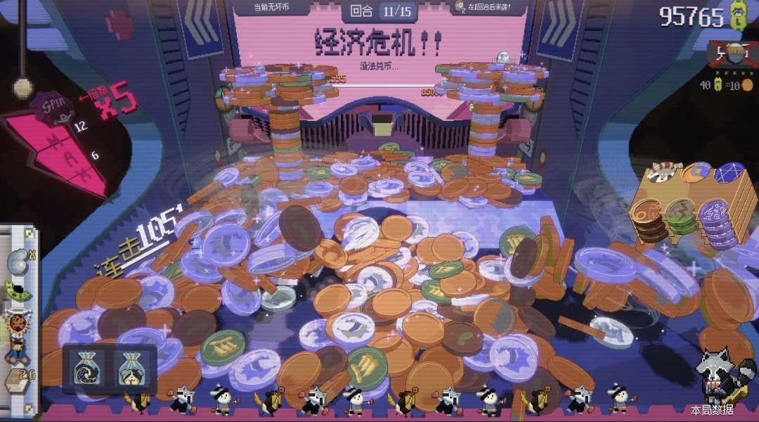 浣熊推币机以街机推币机的核心玩法为基础,玩家需要精准地将硬币推入游戏区域,通过碰撞和叠加实现硬币连锁掉落和得分。相比传统纯粹依靠运气和技巧的推币游戏,浣熊推币机融入了肉鸽游戏卡组构建系统,玩家在游戏过程中不仅需要瞄准最佳推币时机,更要根据自身卡组搭配选择合适的特殊硬币和道具。