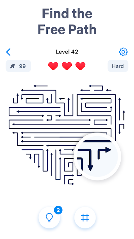 在《箭头拼图》中,玩家面对的是一个由箭头组成的复杂迷宫。每个箭头指向不同方向,玩家的任务是在确保道路畅通的情况下点击箭头将它们逐步移出棋盘。点击顺序尤为关键,因为错误的步骤可能导致某些箭头被阻挡,无法移动。若错误点击被阻挡的箭头,玩家将会失去一条生命。游戏中的生命数有限,这意味着玩家需要冷静思考,避免盲目点击。