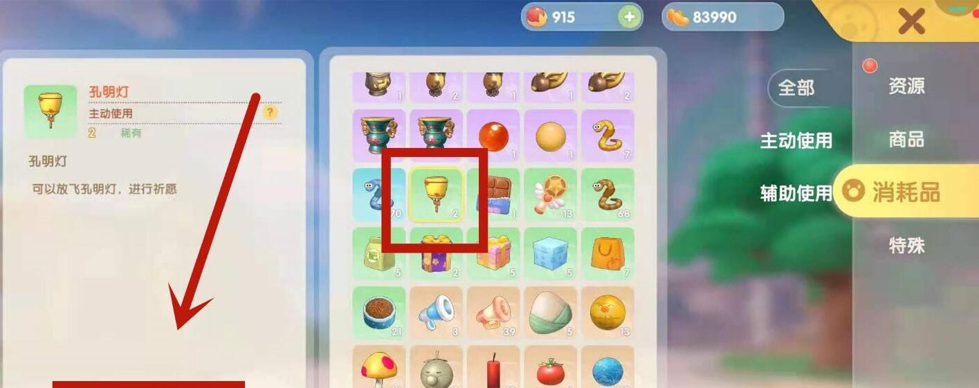 2、之后可以打开背包,在消耗品中找到孔明灯,并使用;