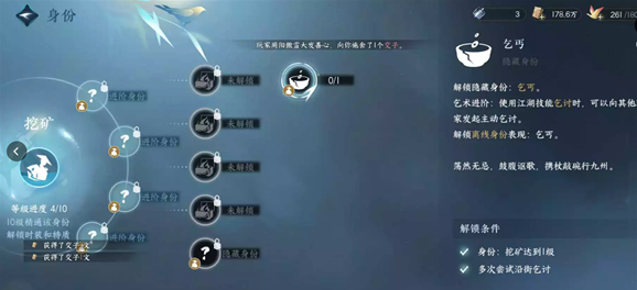 通过成功乞讨一次后,在游戏的身份系统中,特别是挖矿一栏里解锁隐藏身份“乞丐”。