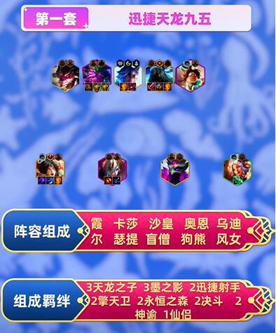组成羁绊:3天龙之子、3墨之影、2迅捷射手、2擎天卫、2永恒之森、2决斗、2神谕、1仙侣