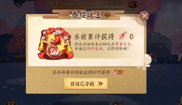 4、通过完成花合战任务还能够获得【春樱暖玉】,在活动结束之后就可以将该物品转化成为勾玉。