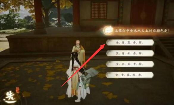 3、根据金对应金,蓝对应水,青对应木,赤对应火,棕对应土来根据五行相生的顺序点亮商灯,完成解谜。