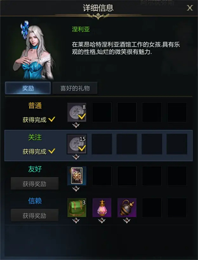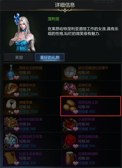涅利亚每天可以通过问候(社交动作)以及心潮如歌与爱情小夜曲(乐谱)增加775点的好感度,喜欢的道具为莱昂哈特土豆,可以在阿尔忒弥斯大陆流浪商人处进行兑换抽取,好感度达到信赖后,预计一共能够获得:23个古代金币(23000银币)+1张涅利亚(莱昂哈特)蓝色卡片+3个蓝色品质通用铭刻随机包+魅力增加药水(+10魅力)+体力增加药水(+5体力)