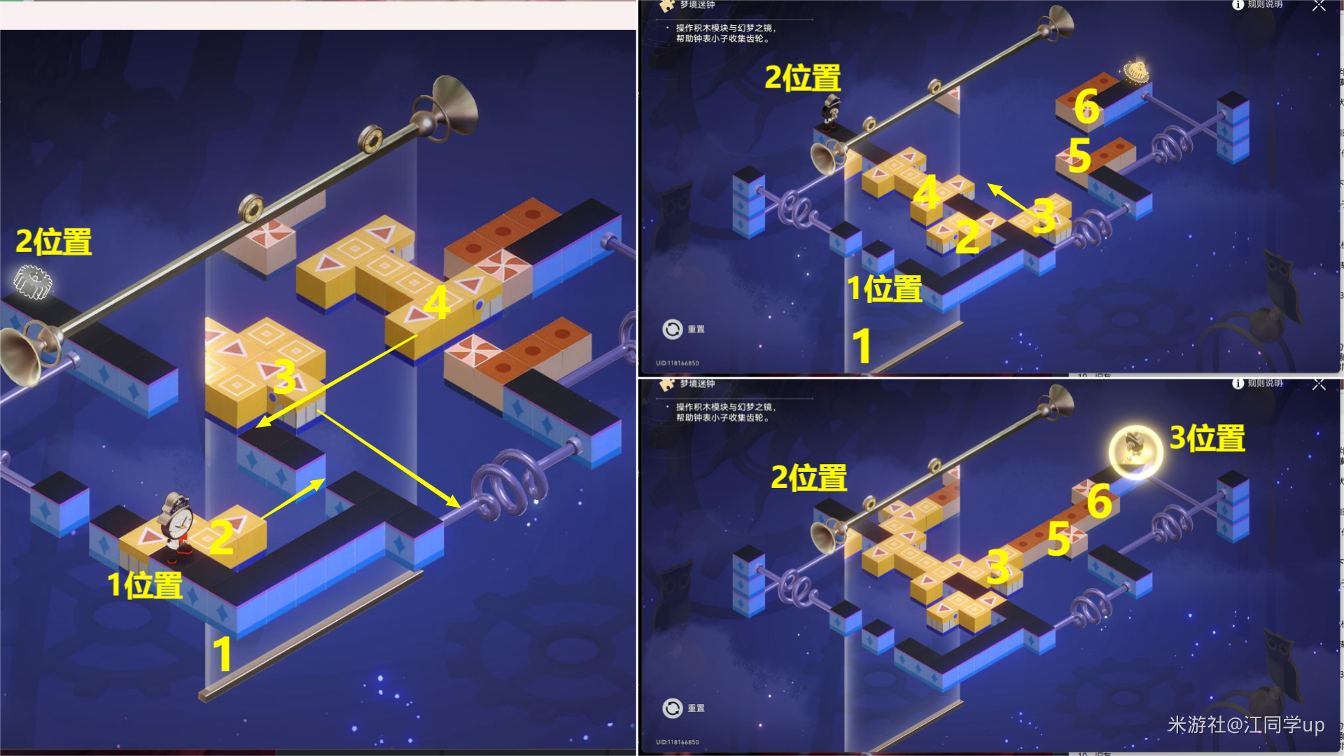 1)将1镜子移到最左下,将1黄色模块移到右上角,将2黄色模块移到右下角,将3黄色模块移到下图位置,【钟表小子】会从1位置到2位置