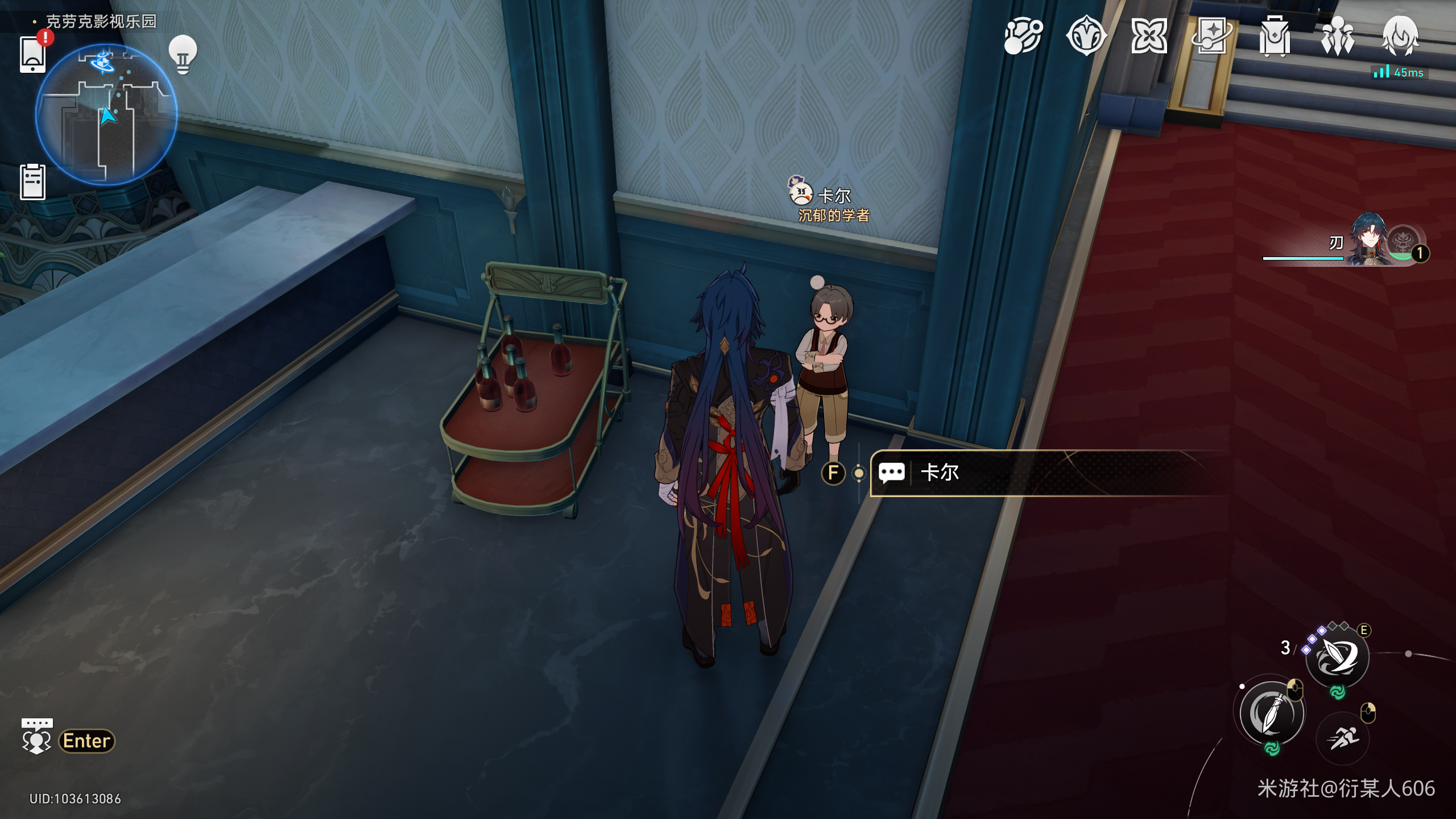 在如图所示位置与NPC卡尔对话,使用钟表把戏将其心情调整为悲郁后获得