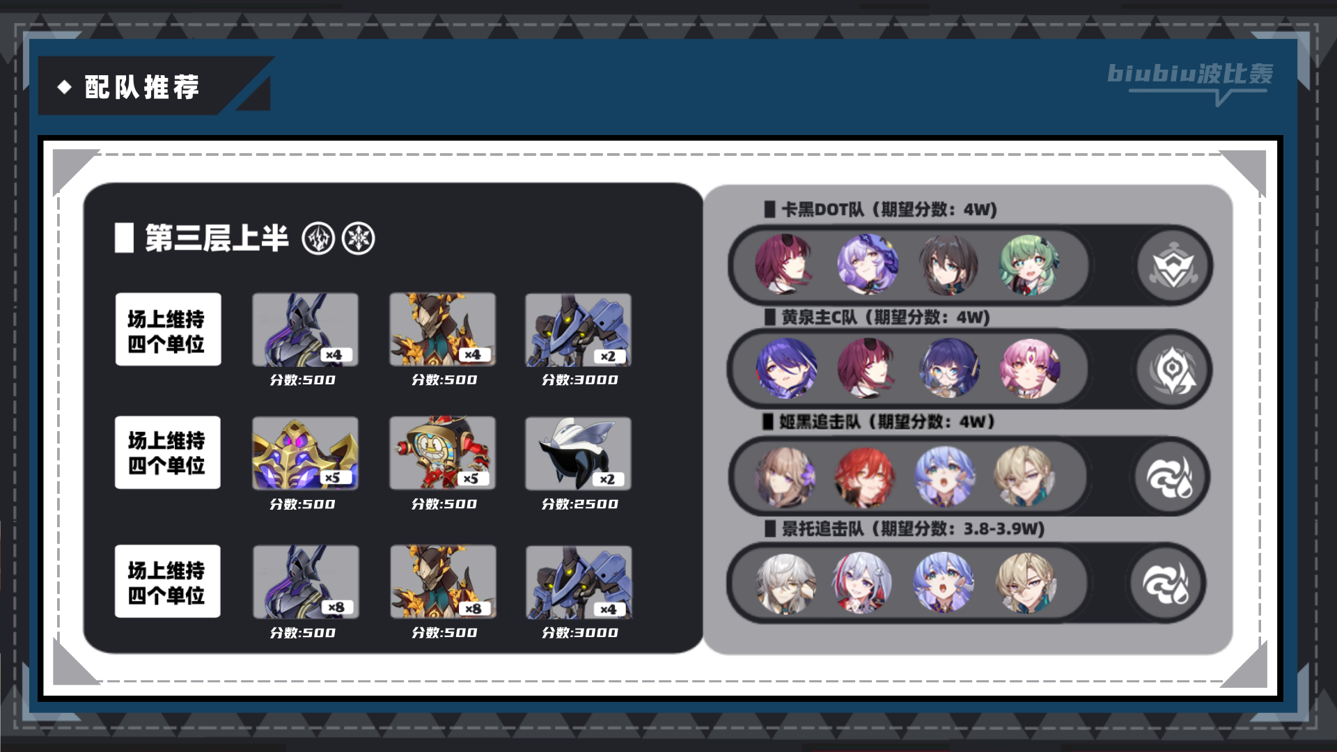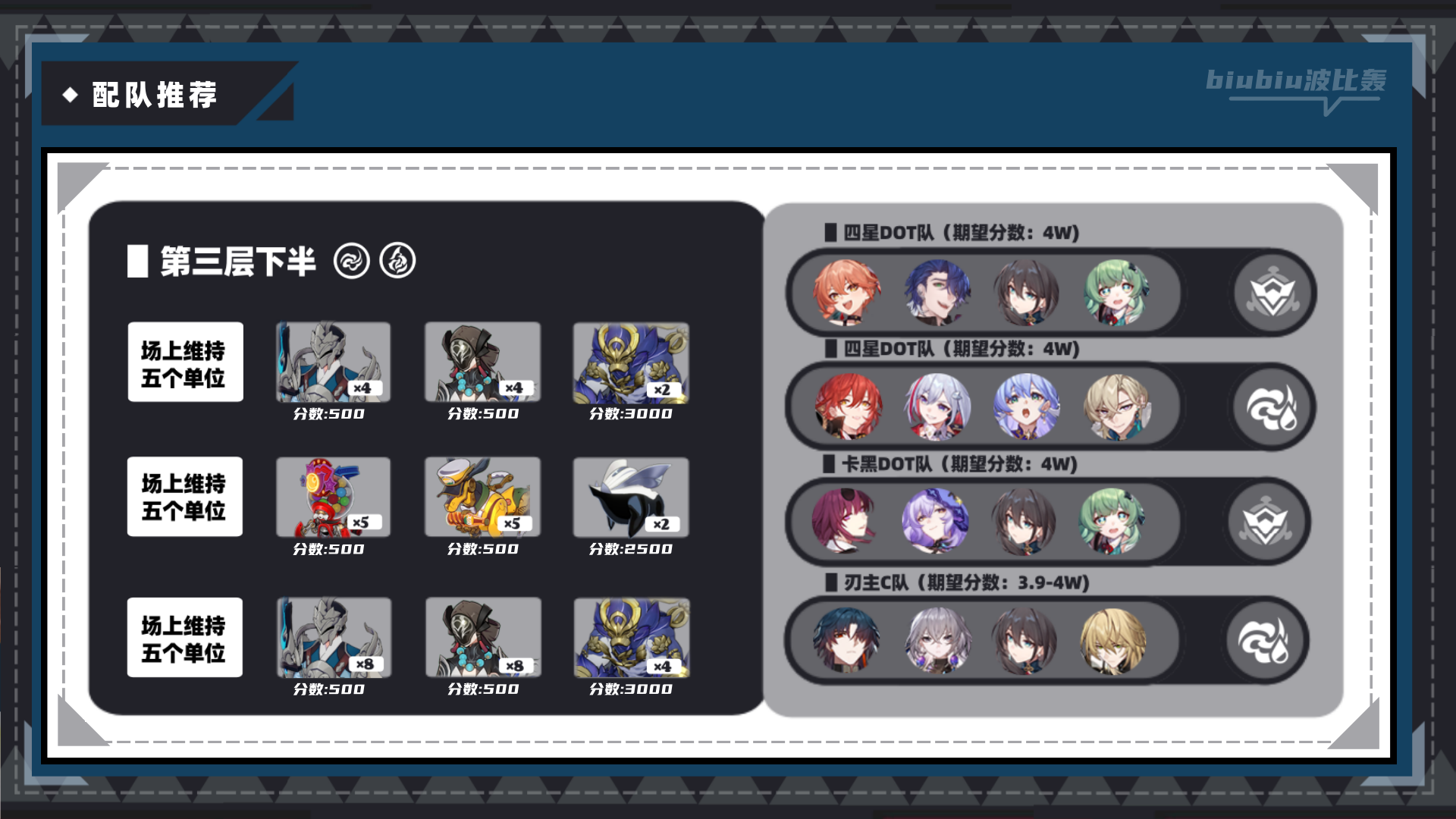 ●受本期buff影响,选择与敌方弱点属性相匹配的持续伤害角色很容易就能拿高分;比如:三层上半可选择卡芙卡+桂乃芬;三层下半可选黑天鹅/桑博/桂乃芬;四层上半可选桂乃芬+卡芙卡;四层下半可选卡芙卡+黑天鹅/桑博组成的DOT队;