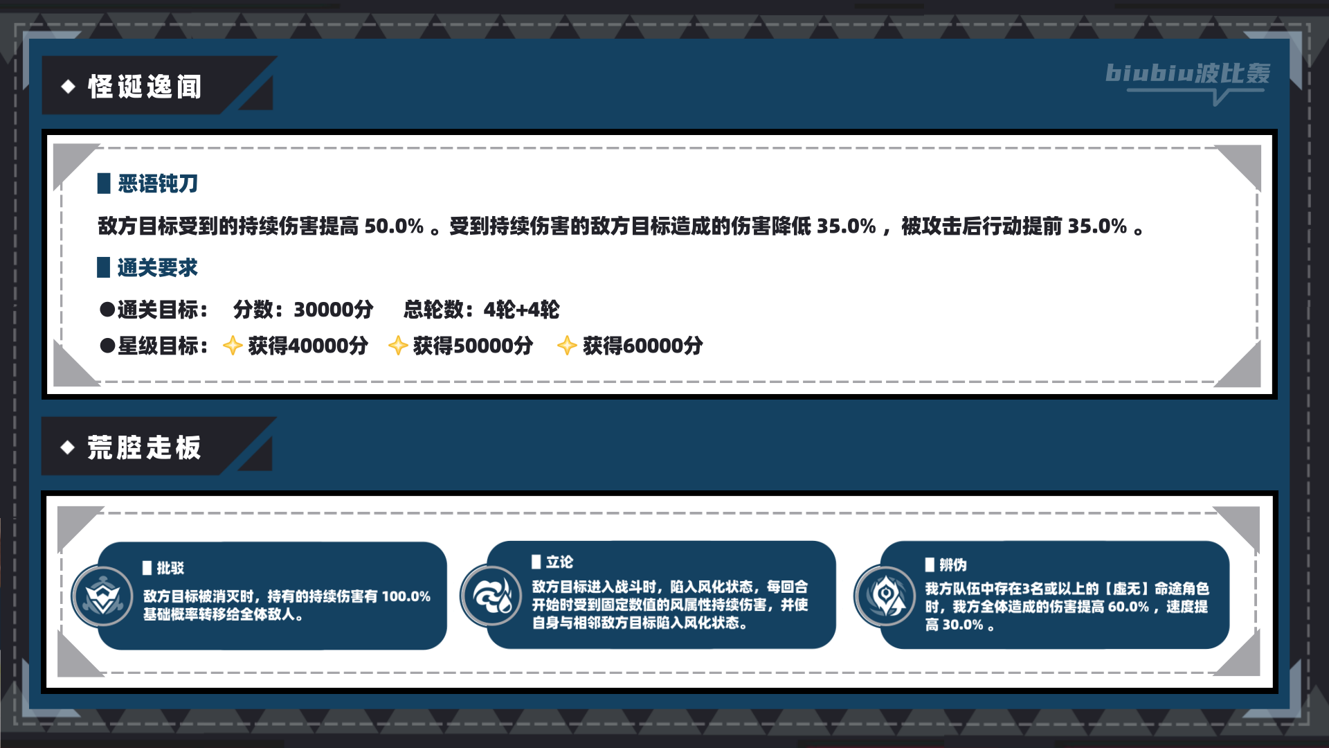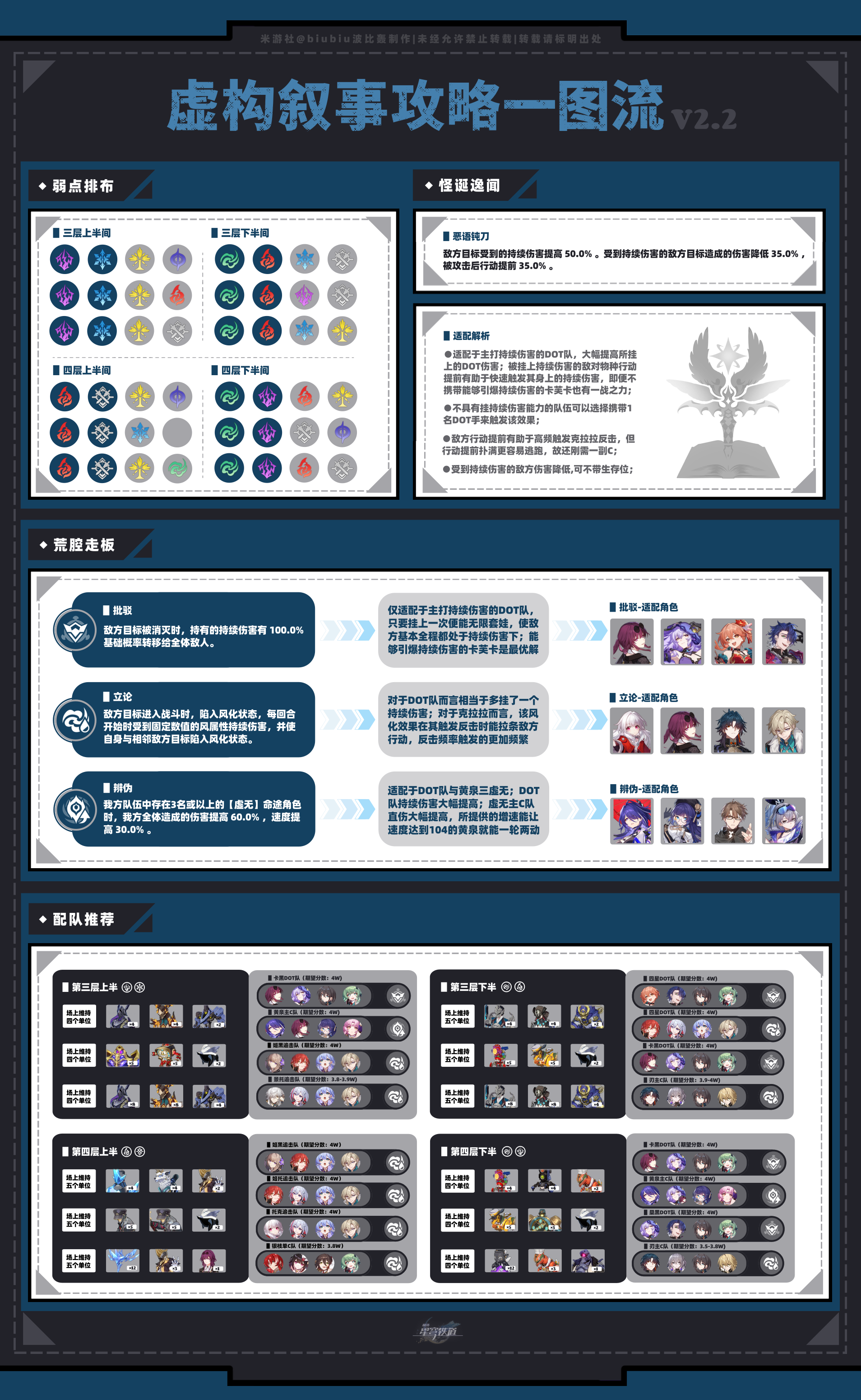本期虚构叙事从综合层面考量难度适中,选择合适的配队很容易就能拿满奖励;怪诞逸闻及荒腔走板对主打持续伤害的DOT队帮助巨大,在配队时可以进行优先考虑;同时敌方行动提前还较利于克拉拉高频触发反击,也能喝到汤;