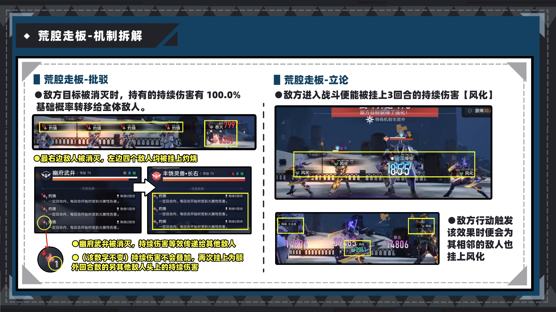 单名敌人身上若挂上了多个持续伤害,在其被消灭时,能全部转移给场上每个敌人;实战较为直观的体验是:在轮到敌方行动时会连续结算大量的持续伤害,能一次性使敌方损失大量的生命值;