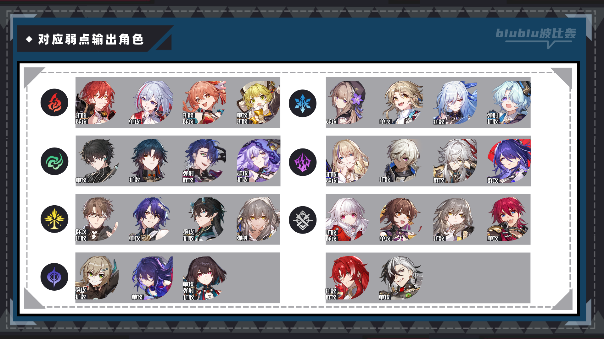 上面是截止当前版本各属性输出角色汇总,同时也标明出了他们的主要攻击类型(群攻、单攻、扩散、弹射);在考虑虚构叙事的配队时,可以拿出来与前两张的弱点属性表比对一下,选择其所在的体系就会自己配队了;