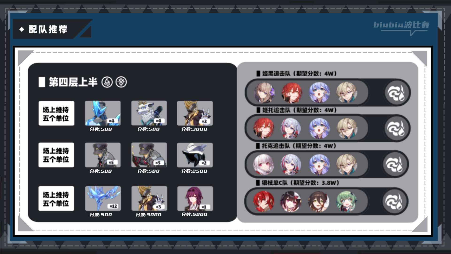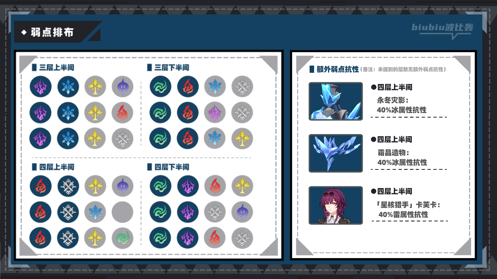 ●虽然四层上半有冰、雷抗,但冰抗仅存在于小怪身上,黑塔+姬子组成的追击队基本不受影响,由于没有冰弱,自然也不会优先想到其它冰属性单C队;而雷抗则存在于最终boss身上,一般在全部消灭掉小怪后才会去应对boss,因此你依旧可以选桂乃芬+卡芙卡DOT队,也很容易拿高分;