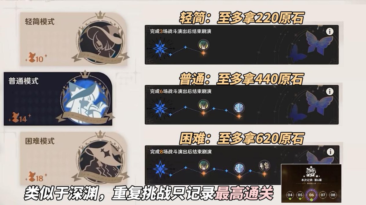 故事背景下「幻想真境剧诗」是一场无休止的冒险剧,分3种挑战难度,轻简/普通/困难,分别对应内含3/6/8场战斗关卡,原石只按照本期最高通过关卡结算。