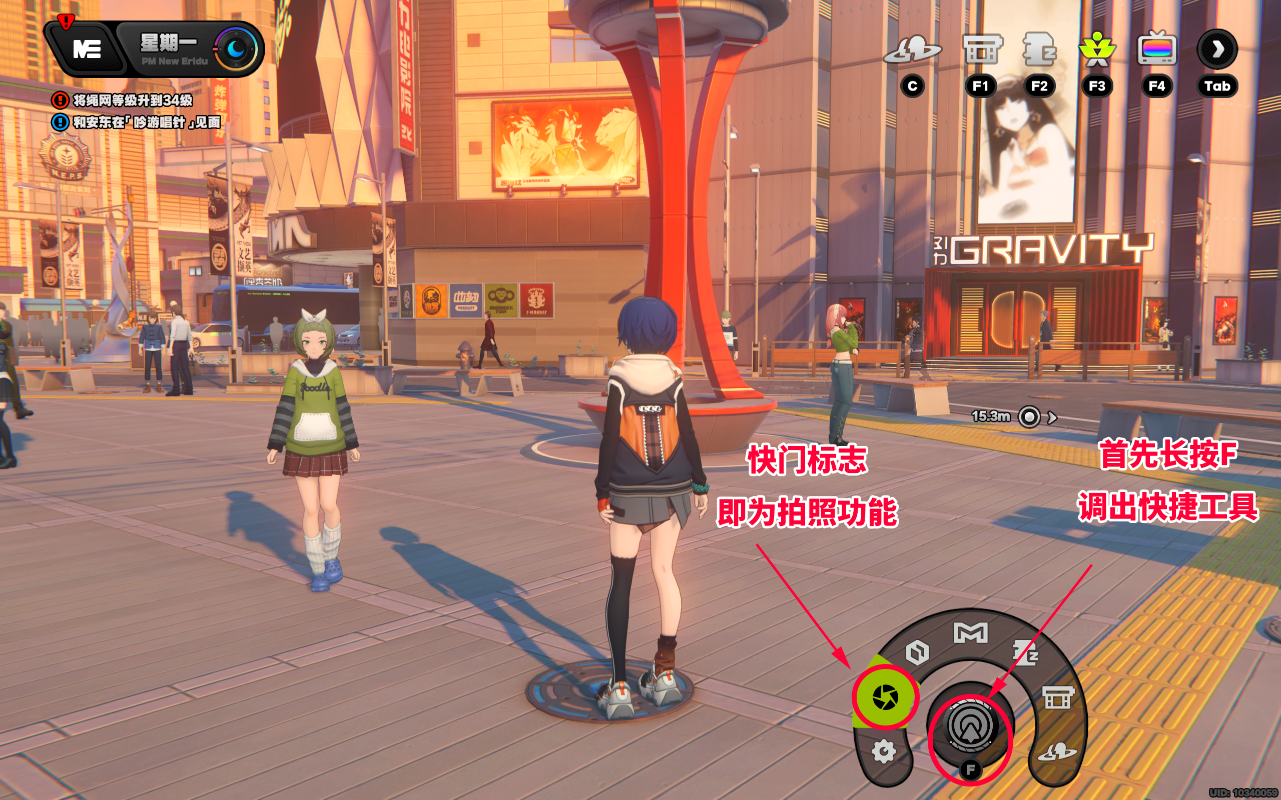 长按F可调出快捷工具,找到其中的“快门”(默认为左数第二位,可自行调整位置)即为拍照功能