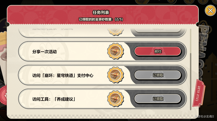 任务都是很简单的,和之前很多的网页活动一样,就是各种登录和访问的任务解锁就行了。完成任务以后可以获得【金表钞】,用【金表钞】拨打【窥梦电话】后就可以获得1次奖励了(一天就可以白嫖60星穹了)。