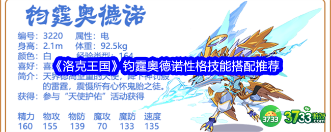 《洛克王国》钧霆奥德诺是一个编号3220的物攻宠物,参与“天使护佑”活动获得!天界德高望重的天使,降下神罚般的雷霆,震慑所有心怀鬼胎之徒。下面是3733游戏小编给大家带来的《洛克王国》钧霆奥德诺性格技能搭配推荐,感兴趣的小伙伴们一起来看看吧。
