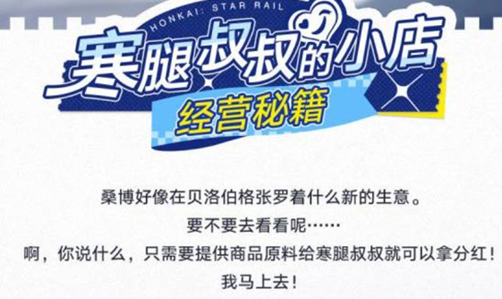 崩坏星穹铁道寒腿叔叔的小店活动怎么玩?崩坏星穹铁道马上就要上线名为寒腿叔叔的小店的全新活动,许多玩家仍然不清楚此活动的玩法到底怎么用。但别担心,小编为各位带来了崩坏星穹铁道寒腿叔叔的小店活动玩法,希望能够帮助到你。